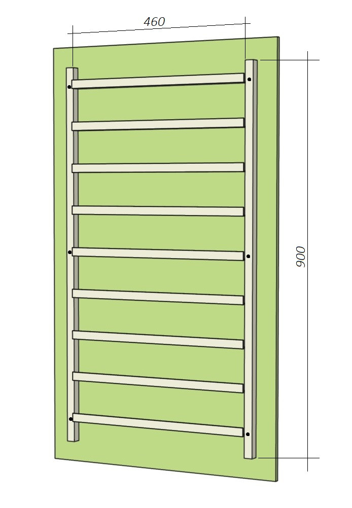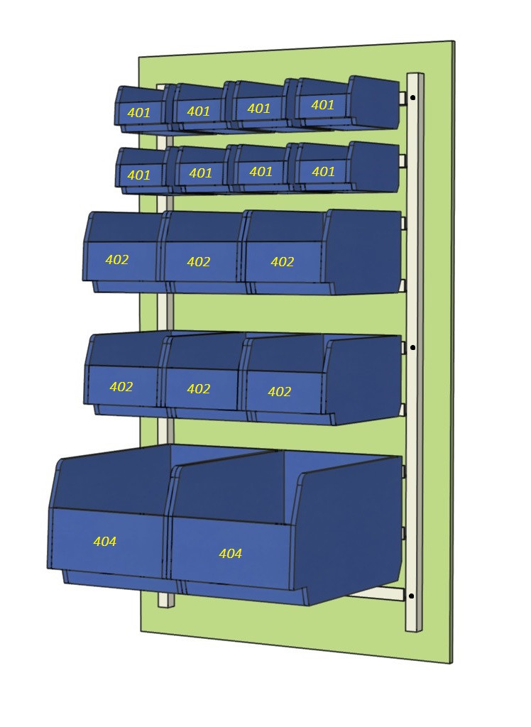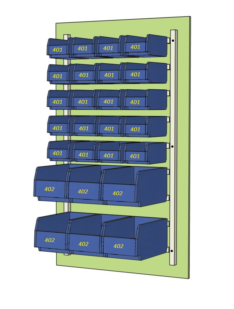 Панель настенная для подвешивания пластиковых лотков для метизов крепится на стену в шести точках. Пластиковые лотки навешиваются на направляющие зацепы. Максимальное число рядов — девять (для лотков 12.401).