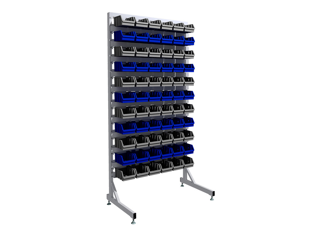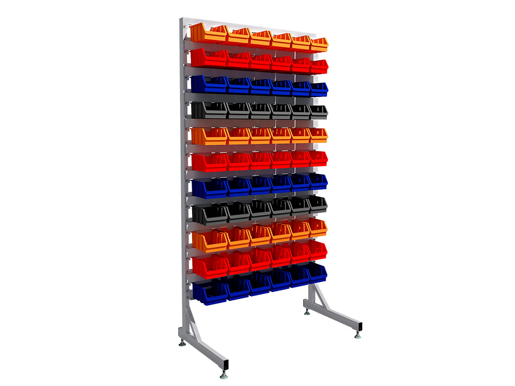 Ярусы для навешивания пластиковых лотков (ящиков) сделаны из листовой стали. Они обеспечивают надежное крепление и точное позиционирование ячеек на стеллаже. Каждая горизонтальная деталь несущей панели фиксируется к стойке в четырех точках.