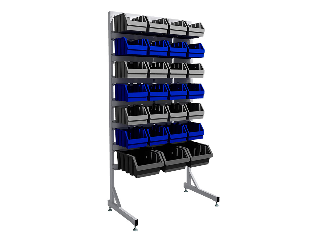 Ярусы для навешивания пластиковых лотков (ящиков) сделаны из листовой стали. Они обеспечивают надежное крепление и точное позиционирование ячеек на стеллаже. Каждая горизонтальная деталь несущей панели фиксируется к стойке в четырех точках.