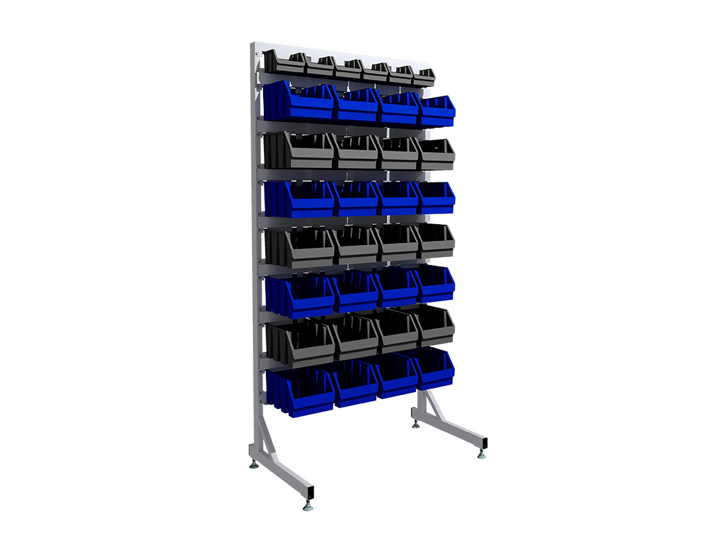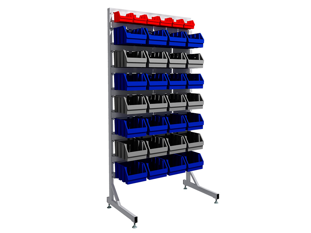 Ярусы для навешивания пластиковых лотков (ящиков) сделаны из листовой стали. Они обеспечивают надежное крепление и точное позиционирование ячеек на стеллаже. Каждая горизонтальная деталь несущей панели фиксируется к стойке в четырех точках.