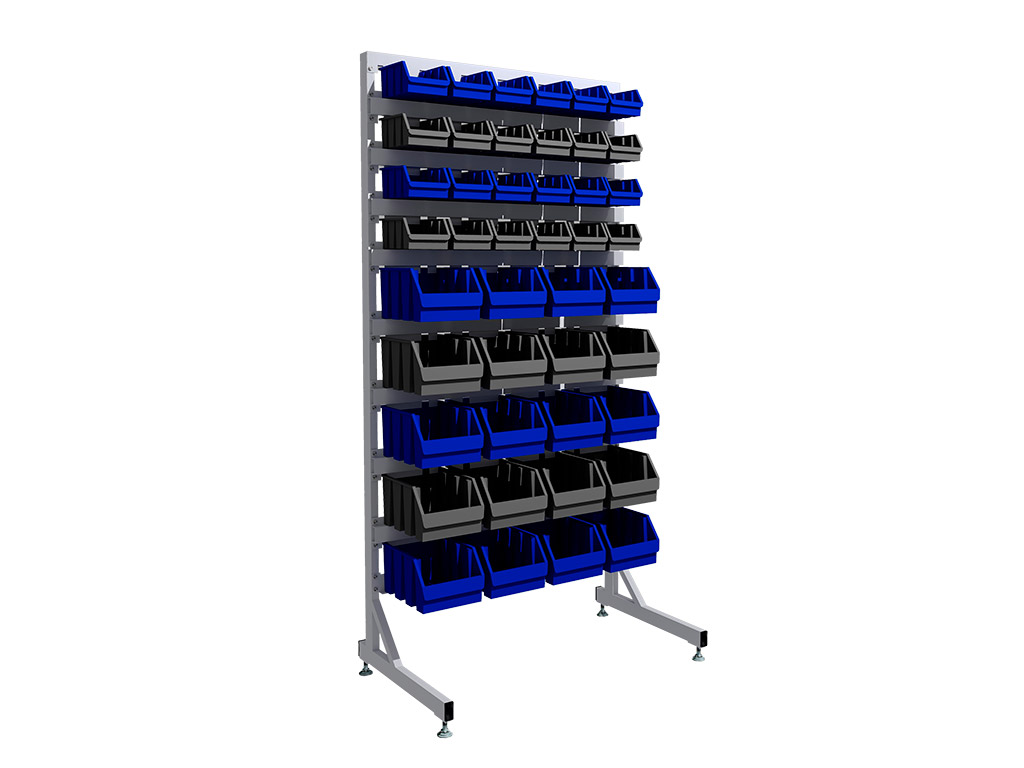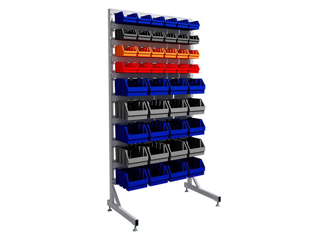 Ярусы для навешивания пластиковых лотков (ящиков) сделаны из листовой стали. Они обеспечивают надежное крепление и точное позиционирование ячеек на стеллаже. Каждая горизонтальная деталь несущей панели фиксируется к стойке в четырех точках.