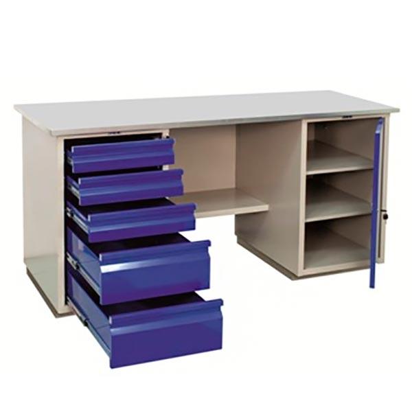 • Верстак окрашен порошковой краской, цвет покрытия корпуса серый шагрень (RAL 7038), лицевая панель дверцы тумбы – синий шагрень (RAL 5002)